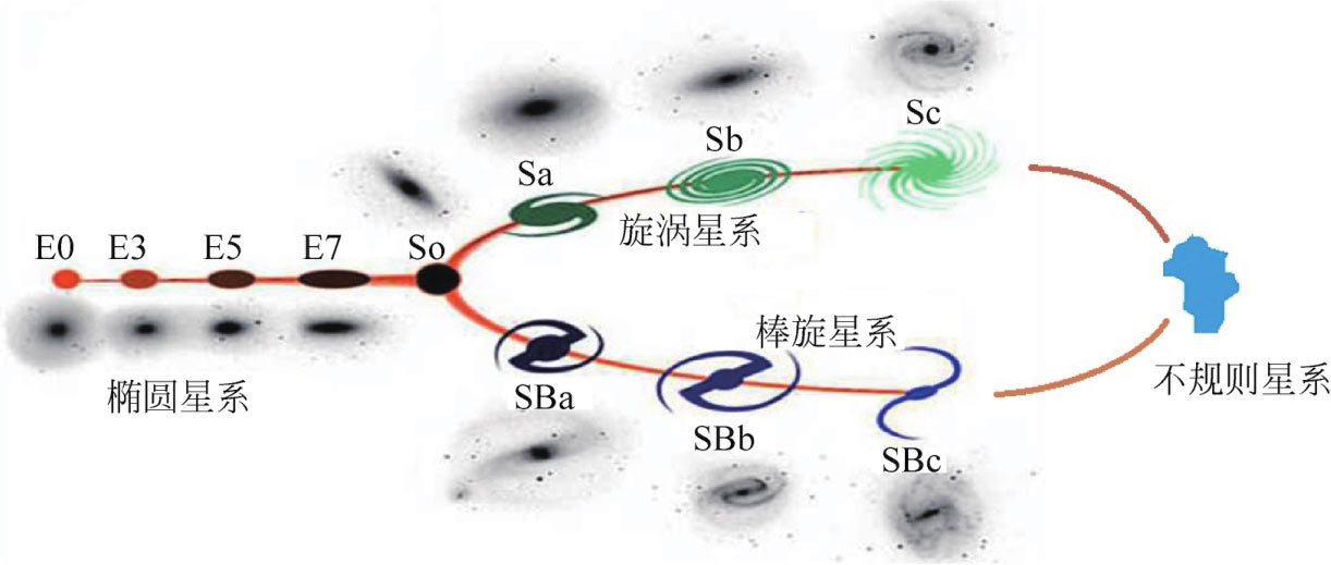 哈勃将宇宙中的星系按其外观分为两类:椭圆星系和旋涡星系,旋涡星系中又包括正常的旋涡星系和棒旋星系。此外,还观察到一些形状不太规则的星系,暂时称它们为不规则星系,见图1-5-4。哈勃的星系分类规则被沿用至今,不过从现代天体物理的观点看,哈勃对这几类星系演化历史的解释却不正确。