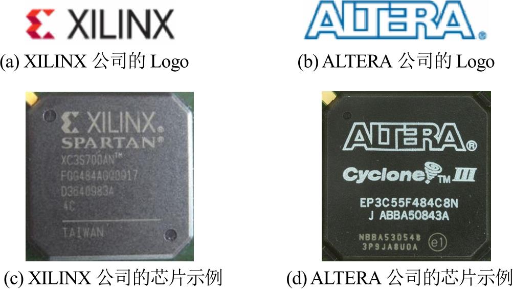 XILINX公司和ALTERA公司主要生产CPLD芯片和FPGA芯片,这两个公司的Logo和芯片示例如图1-38所示。