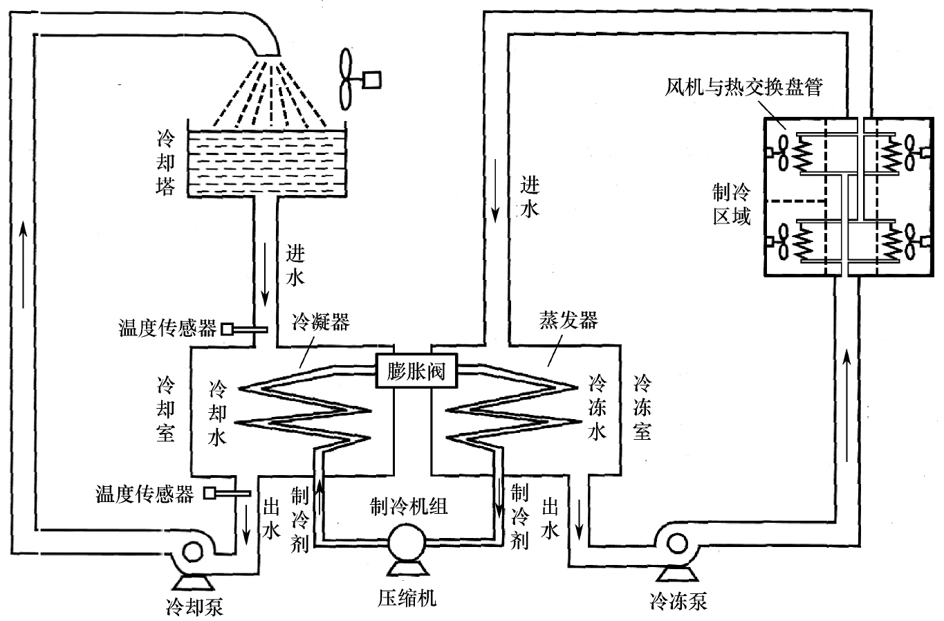 冷冻水循环系统的工作原理:制冷区域的热交换盘管中的水进入制冷机组的冷冻室,经蒸发器冷却后水温降低(如7℃);低温水被冷冻泵抽吸并排往制冷区域的各个热交换盘管,在风机作用下,空气通过低温盘管(内有低温水通过)时温度下降,使制冷区域的室内空气温度下降,热交换盘管内的水温则会升高(如升高到12℃);从盘管中流出的升温水汇集后又流进冷冻室,被低温蒸发器冷却后,再经冷冻泵抽吸并排往制冷区域的各个热交换盘管,开始下一次冷冻水循环。
