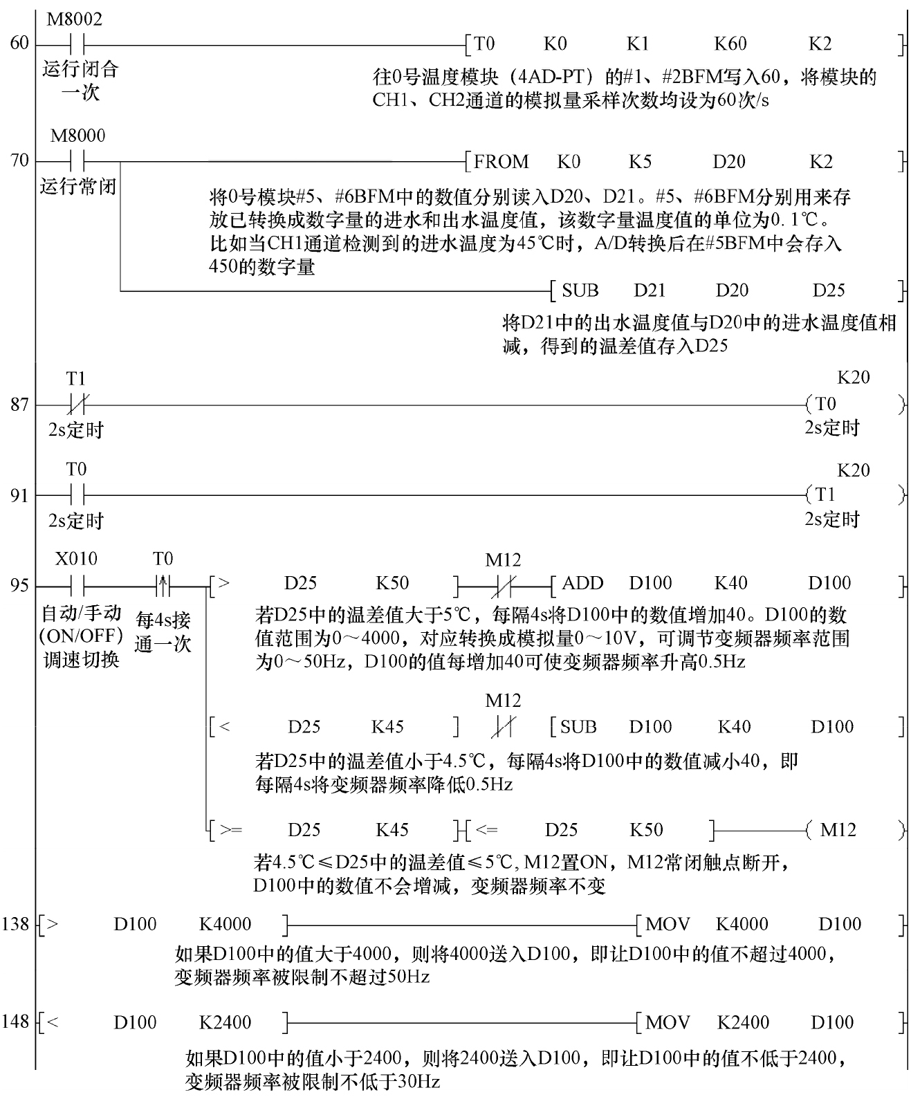 温差检测与自动调速程序如图4-11所示。温度检测模块(FX 2N -4AD-PT)将出水和进水温度传感器检测到的温度值转换成数字量,分别存入D21和D20,两者相减后得到的温差值存入D25。在自动调速方式(X010常开触点闭合)时,PLC每隔4s检测一次温差,如果温差值>5℃,自动将D100中的数字量提高40,转换成模拟量去控制变频器,使其频率提升0.5Hz,冷却泵电动机转速随之加快;如果温差值<4.5℃,自动将D100中的数字量减小40,使变频器的频率降低0.5Hz,冷却泵电动机转速随之降低;如果4.5℃≤温差值≤5℃,则D100中的数字量保持不变,变频器的频率不变,冷却泵电动机转速也不变。为了将变频器的频率限制在30~50Hz,程序将D100的数字量限制在2400~4000范围内。