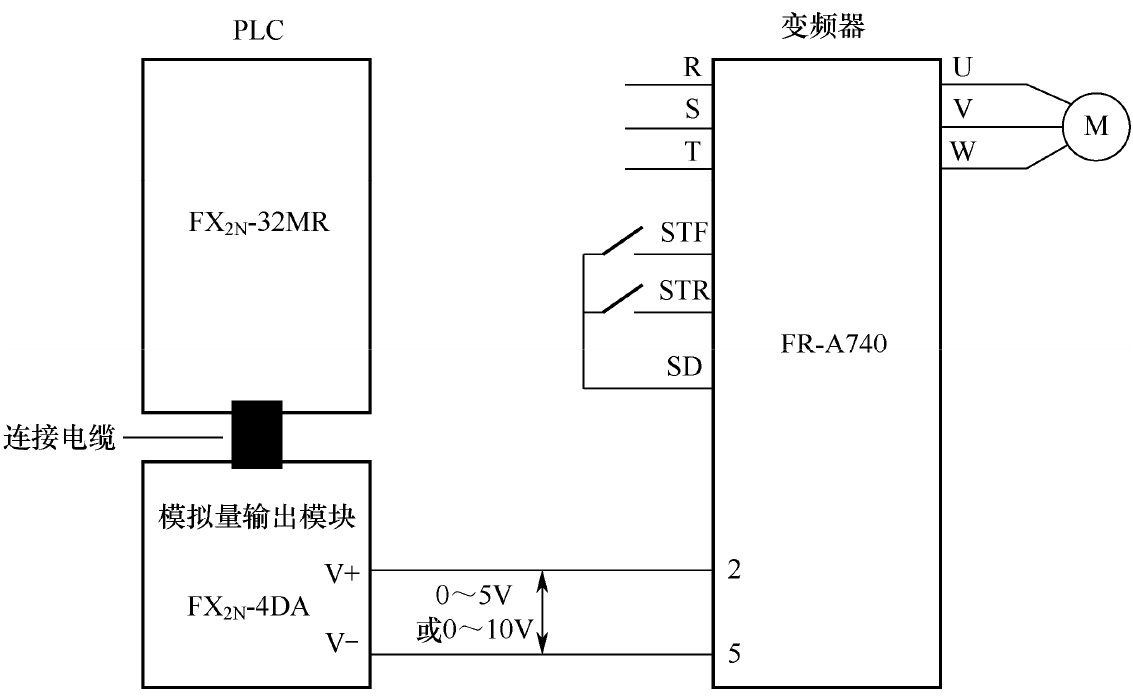 图4-7 PLC以模拟量方式控制变频器的硬件连接