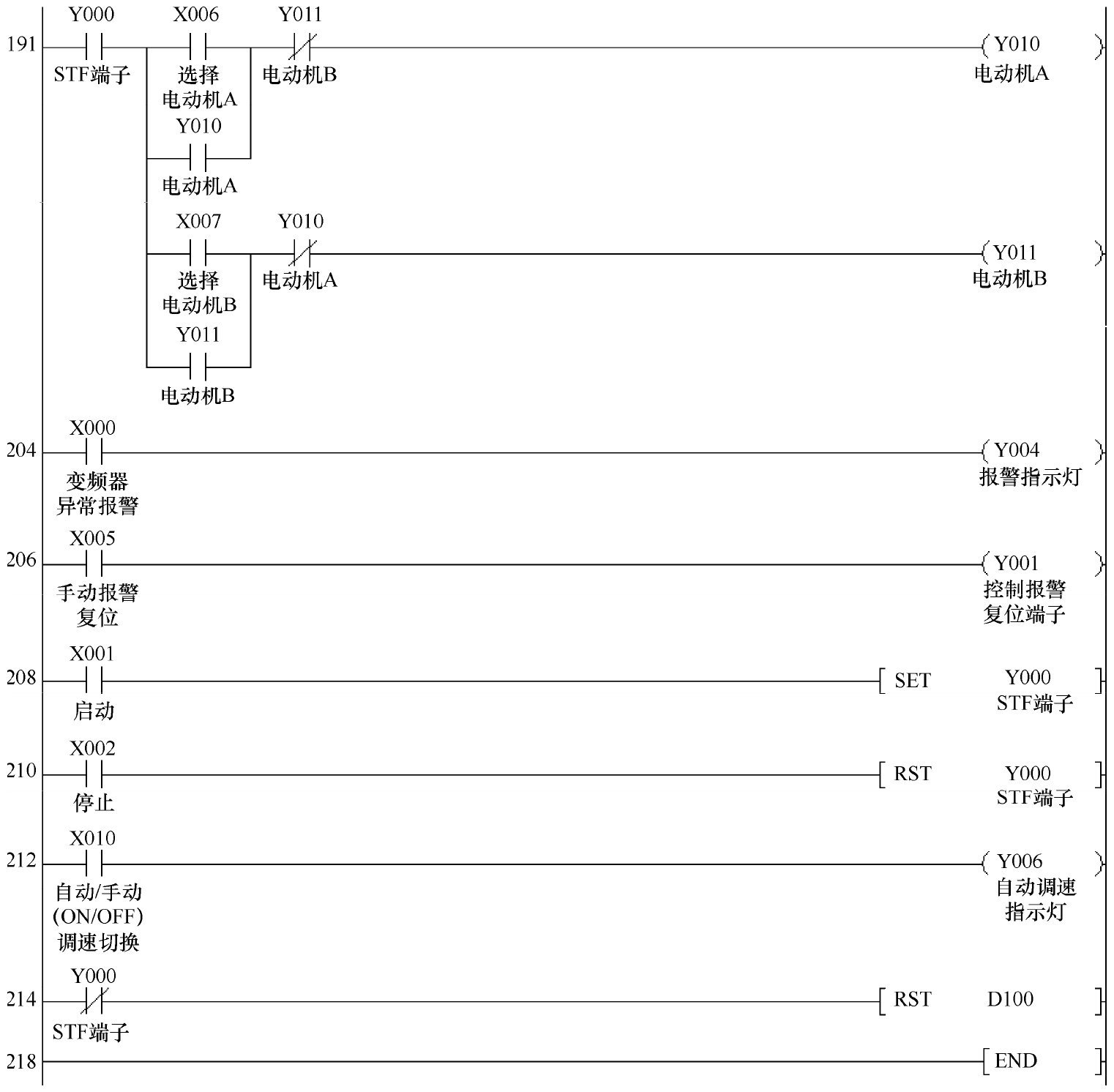 变频器启/停/报警及电动机选择程序如图4-13所示。下面对照图4-9所示线路图和图4-13来说明该程序的工作原理。
