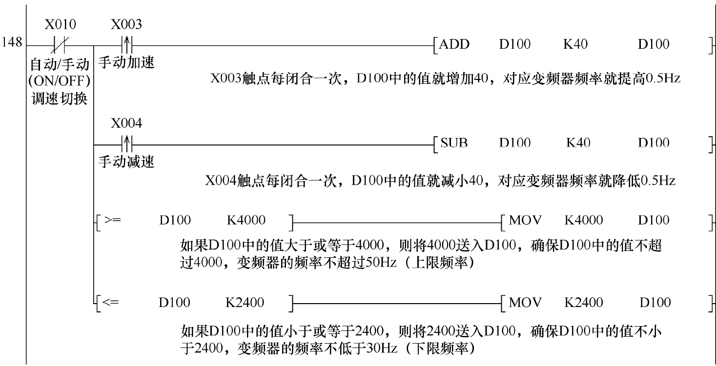 手动调速程序如图4-12所示。在手动调速方式(X010常闭触点闭合)时,X003触点每闭合一次,D100中的数字量就增加40,由DA模块转换成模拟量后使变频器频率提高0.5Hz;X004触点每闭合一次,D100中的数字量就减小40,由DA模块转换成模拟量后使变频器频率降低0.5Hz。为了将变频器的频率限制在30~50Hz,程序将D100中的数字量限制在2400~4000范围内。