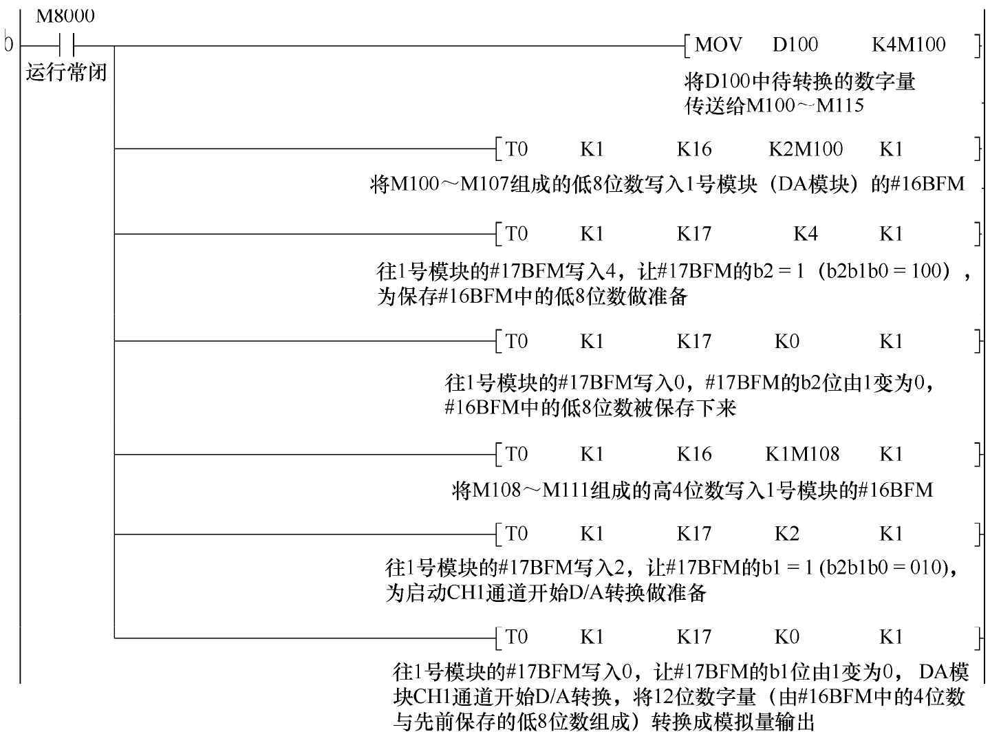 D/A转换程序的功能是将PLC指定存储单元中的数字量转换成模拟量并输出到变频器的调速端子。本例利用FX 2N -2DA模块将PLC的D100单元中的数字量转换成0~10V电压去变频器的2、5端子。D/A转换程序如图4-10所示。