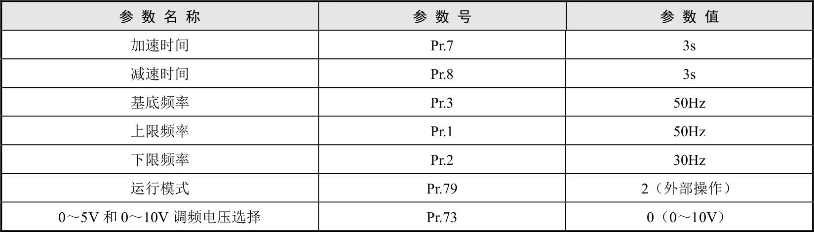 为了满足控制和运行要求,需要对变频器的一些参数进行设置。本例中变频器需设置的参数及参数值如表4-3所示。