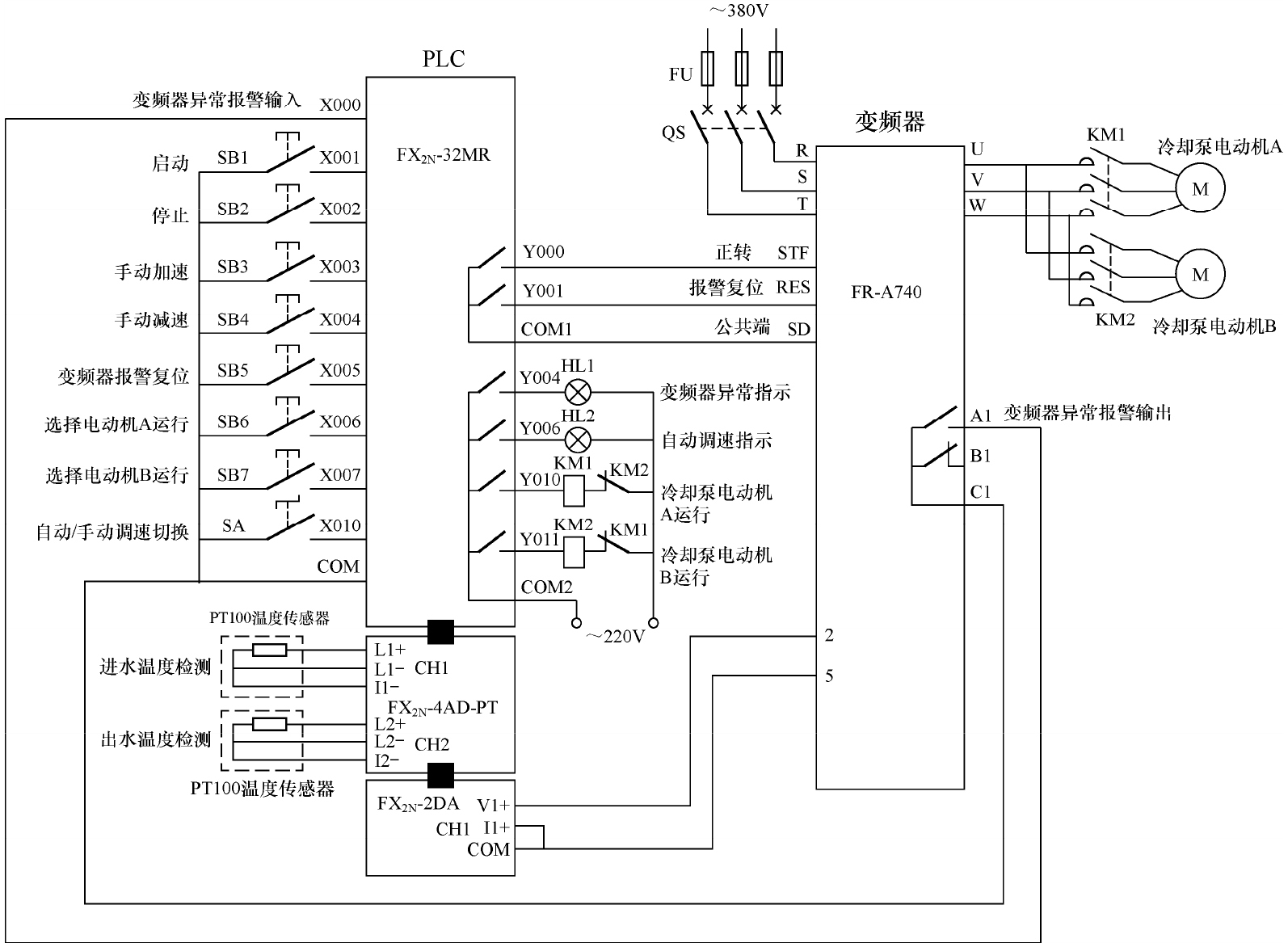 图4-9 中央空调冷却水流量控制的PLC与变频器线路图