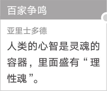 亚里士多德的理论还包含更多细节。他认为动物拥有“感觉魂”,它负责自主运动、感知觉、食欲以及情绪。而“感觉魂”中包含一种人类所独有的“理性魂”,“理性魂”让我们获得了一系列特殊的技能,包括逻辑推理、理性意志、思维及思考问题的能力,也正是这些能力使得我们区别于自然阶梯中的那些更低等的生物。结合古希腊的人类思维革命来看,最为重要的一点在于,亚里士多德的相关知识并非来源于单纯的自省和冥想,而是通过观察他人与周边世界的互动获得的。如今的我们已经普遍能够接受一个观点,即我们身处的世界是一个可被研究的客观物体,但不要忘了,在几千年前,这种看待世界的方式还没出现呢!亚里士多德的思想对后世影响很大,令人欣慰的是,直至今日,人类依旧被科学观察的魅力所吸引。