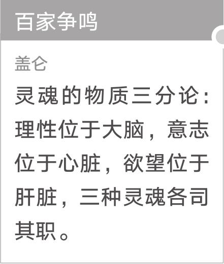 不管怎么说,盖仑知道人类的生命维系依赖食物和呼吸,也相信身体能够将摄入的物质转化为血肉和灵魂。踩着巨人希波克拉底、柏拉图、苏格拉底和亚里士多德的肩膀,盖仑提出了灵魂的物质三分论。他发展了柏拉图的理论,为其提出的三种灵魂,也就是理性、意志和欲望分别找到了对应的解剖位置:理性位于大脑,意志位于心脏,欲望位于肝脏。三种灵魂各司其职。欲望灵魂负责掌管身体的自然冲动,例如饥渴、生存本能和肉体的欢愉,并由自然灵气所驱动。意志灵魂负责情绪与激情,并由一种从心脏中的血液诞生、通过肺部活动随空气流通的灵气所驱动。理性灵魂掌控了认知活动,包括感知、记忆、决策、思维以及自主活动。盖仑认为心智与肉体之间没有差异。从他的理论中,我们能够看到一些现代概念的雏形,例如意识与潜意识、本我与自我、理性与直觉等。抛开具体细节上的差异,这些概念背后的思想可以说早在公元200年就已经出现了。