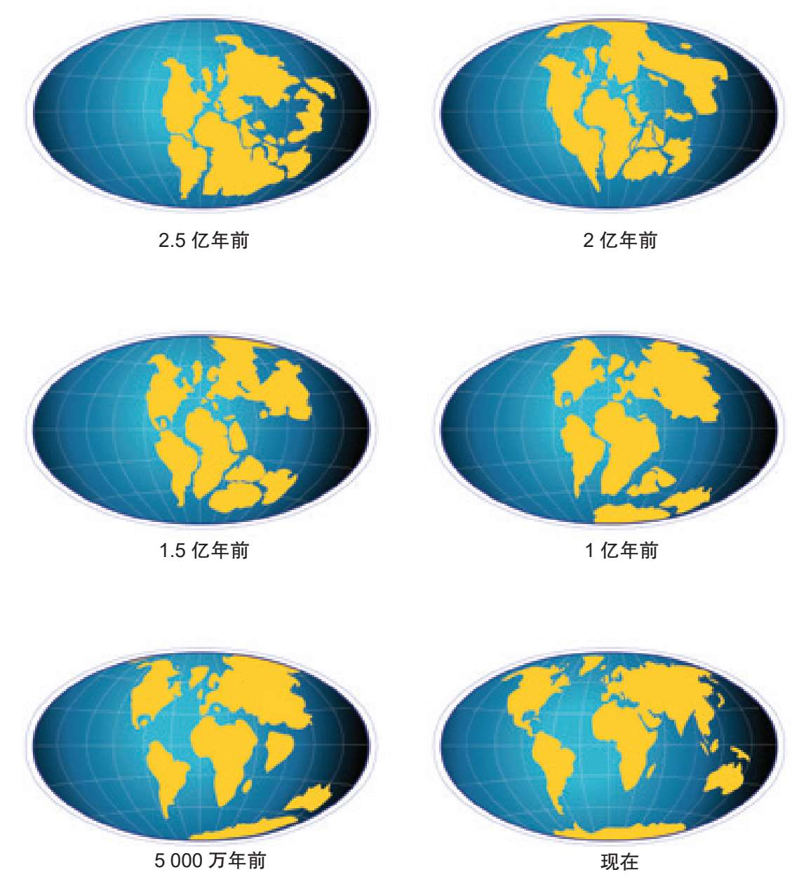 不同时代的大陆分布图。中生代三叠纪的泛大陆是一整块大陆。中生代侏罗纪,泛大陆以特提斯海为界,分为劳亚古陆和冈瓦纳古陆。中生代白垩纪,美洲大陆西移,形成大西洋,印度与澳大利亚向北移动。现在印度横穿赤道,与亚洲连在一起
