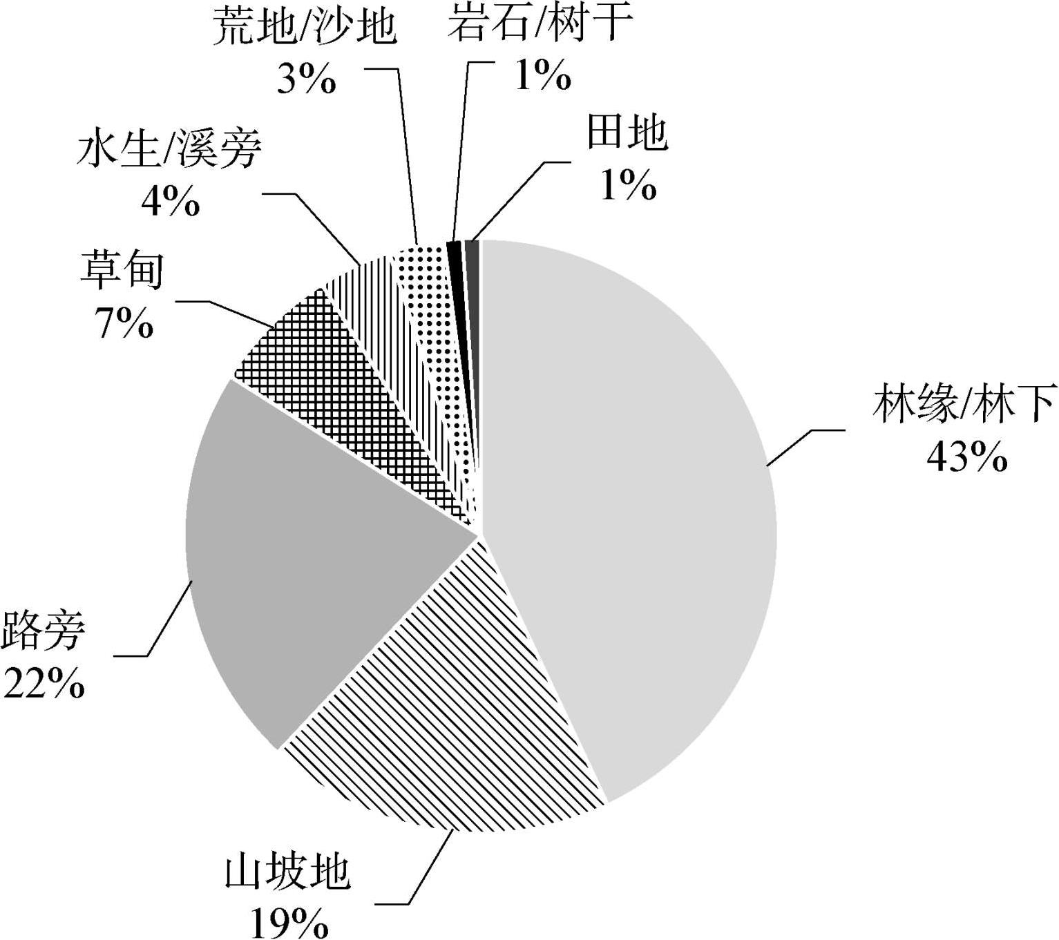 由于部分药用植物可同时占有2种或多种不同生境,因此601种中药资源所占有生境合计957种。同一种药用植物可能分布于多种生境的有356种,占比37.20%,如一些乔木类药用植物侧柏﹑桃树﹑肉桂﹑杜仲﹑厚朴等,以及一些适生性较强的草本类药用植物如青蒿﹑车前草﹑京大戟等中药资源,通常可以在林缘∕林下﹑山坡地﹑路旁﹑荒地﹑草地多种生境下生长。而有些药用植物的分布区域狭窄,如泽泻﹑东方香蒲﹑昆布﹑莲﹑芡等植物只能水生,白及﹑白术﹑北苍术﹑赤芝﹑茯苓等只能生长在林缘∕林下。适合在林缘∕林下生长的药用植物占比为42.53%;适合生长在路旁﹑山坡地﹑荒地∕沙地的药用植物分别占比21.94%﹑18.60%及3.24%,三者合计43.78%。适合生长在林缘∕林下或土地贫瘠的路旁﹑山坡地﹑荒地∕沙地的药用植物合计86.31%,而主要以大田栽培为主的药用植物只占到0.94%。见表1-5﹑1-6和图1-6﹑1-7。