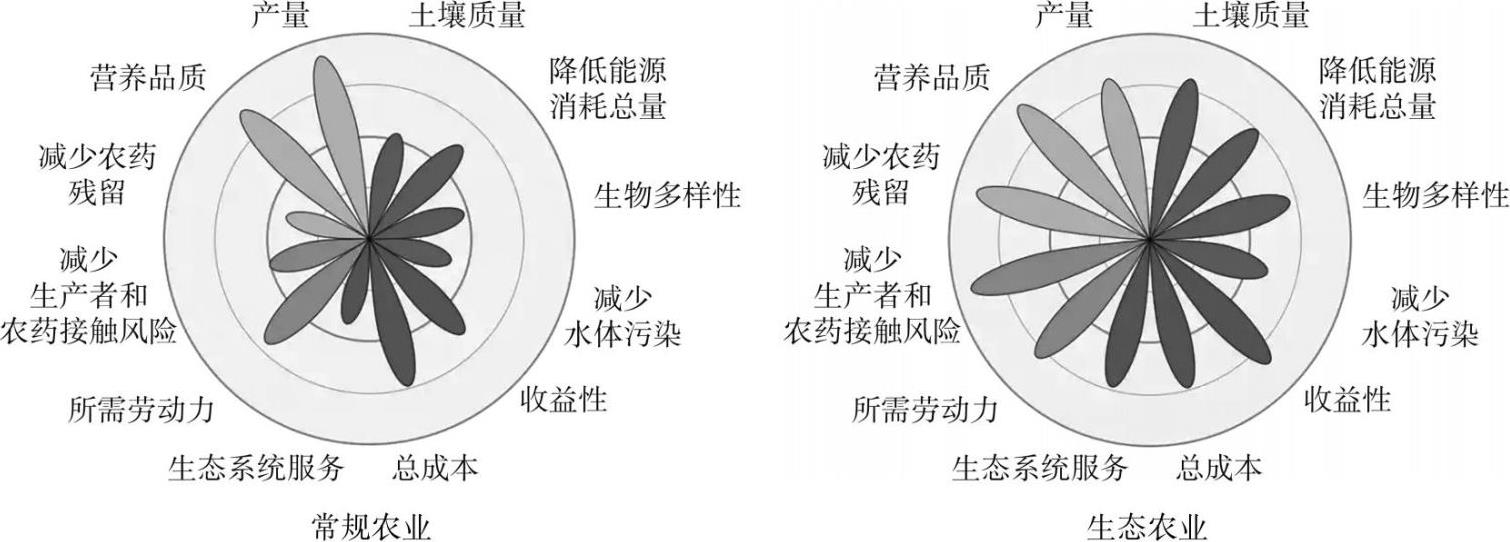 2016年,华盛顿州立大学学者John P.Reganold在《自然·植物》发表文章,回顾和分析了40年来有机农业与常规农业的综合效益(图1-5)。可见,较于化学农业,生态农业拥有投入小﹑产出高﹑无污染﹑风险小的优势,其综合优势是极其明显。此外,又在英国 The Guardian 上,就“我们可否通过有机农业喂饱100亿人口?”给出了生态农业解决人类温饱问题的答案。可以说,生态农业必将成为21世纪的全球农业的新方向。