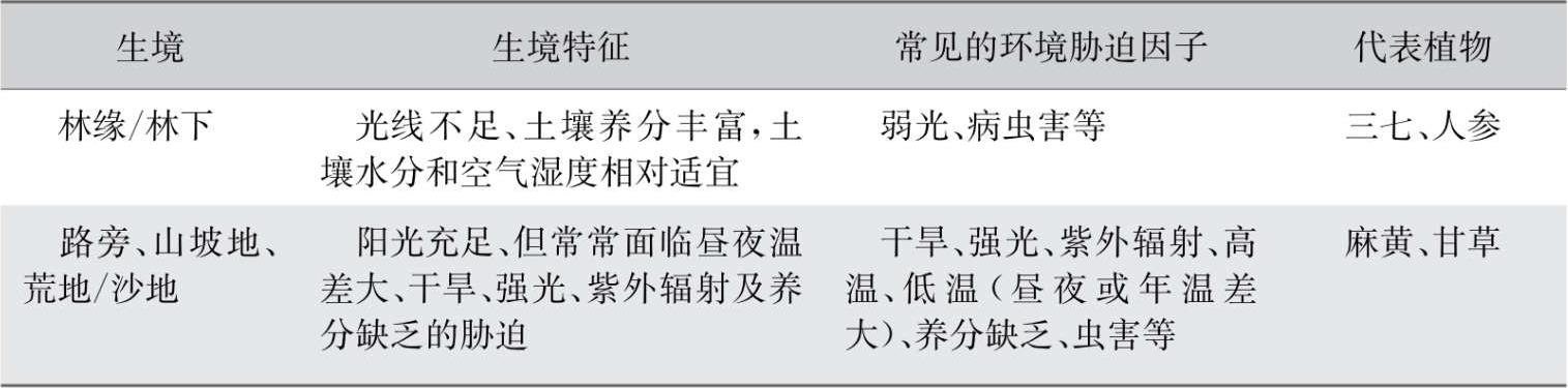 药用植物在生长发育过程中常会经历各种环境胁迫。常见的环境胁迫包括高温或低温胁迫﹑强光或弱光胁迫﹑紫外线胁迫﹑盐碱﹑养分胁迫﹑干旱或淹水胁迫﹑病虫害等。根据上文对药用植物生活型及分布的统计,可以将药用植物最常见的生境分为两大类:一类是林缘∕林下,这类生境分布的药用植物约有42.53%,另一大类为路旁﹑山坡地﹑荒地∕沙地,这类生境分布的药用植物约有43.78%。那么这两类生境中的药用植物通常会受到什么样的环境胁迫呢?