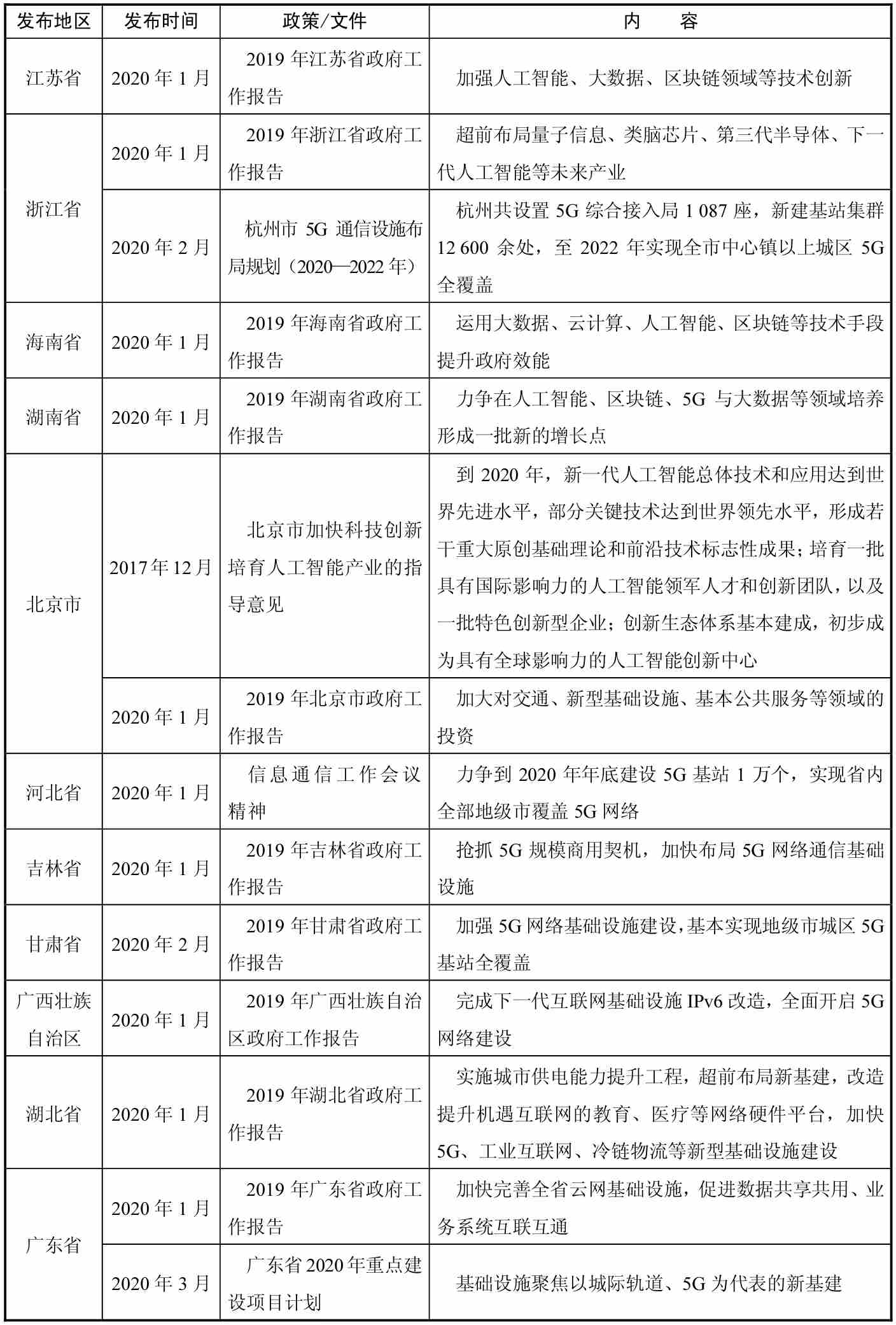 自2020年提出“加快新基建”以来,全国20多个省(直辖市)政府先后发布重点项目投资计划,科技企业也纷纷投入新基建浪潮中,使我国新基建进入加速推进阶段。省(直辖市)政府与卫星互联网融合的新技术相关的政策/文件见表1-3。