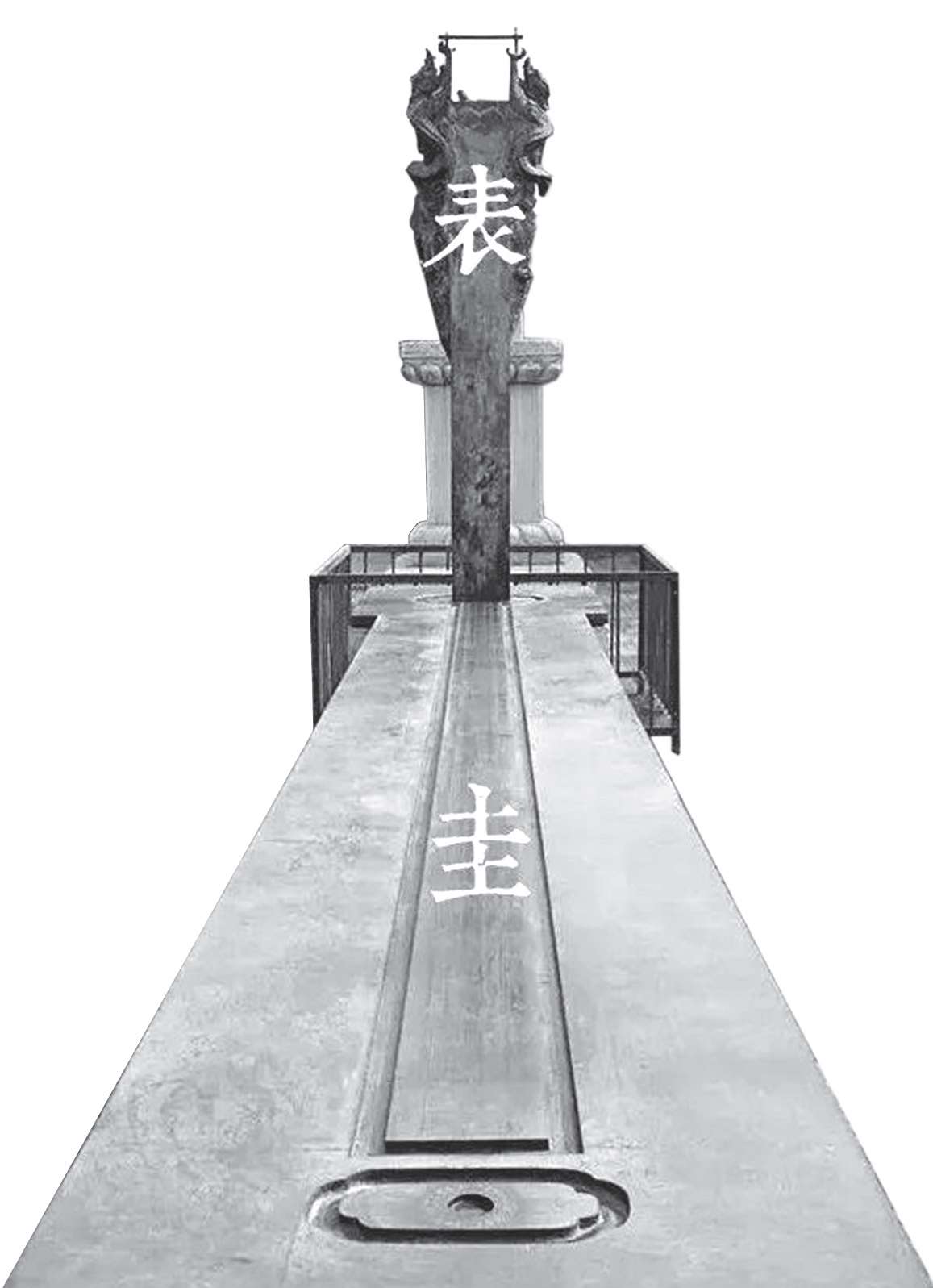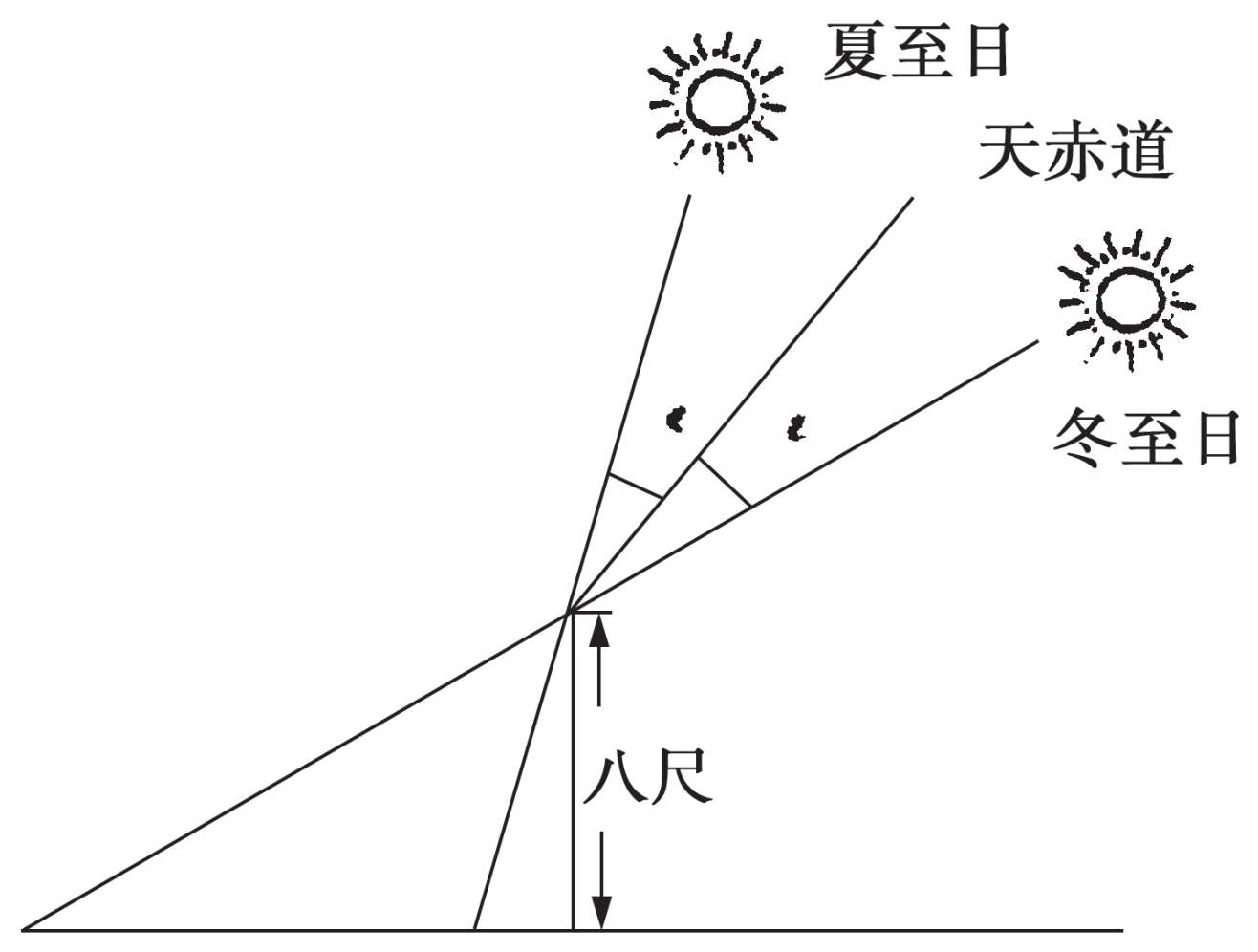 中国绝大部分地区的纬度高于北回归线(即23.5°),正午时的表影总是在表的正北方向。把一块有刻度的平板,紧接表基处朝北水平放置,便可直接读出正午时表影的长度。本来“圭”字,仅指片状玉器,由于圭曾作为测量土地的标准尺子广泛使用过,后来转而把测量影长的工具也叫做圭,圭和表的结合就称为圭表(见图3-3)。