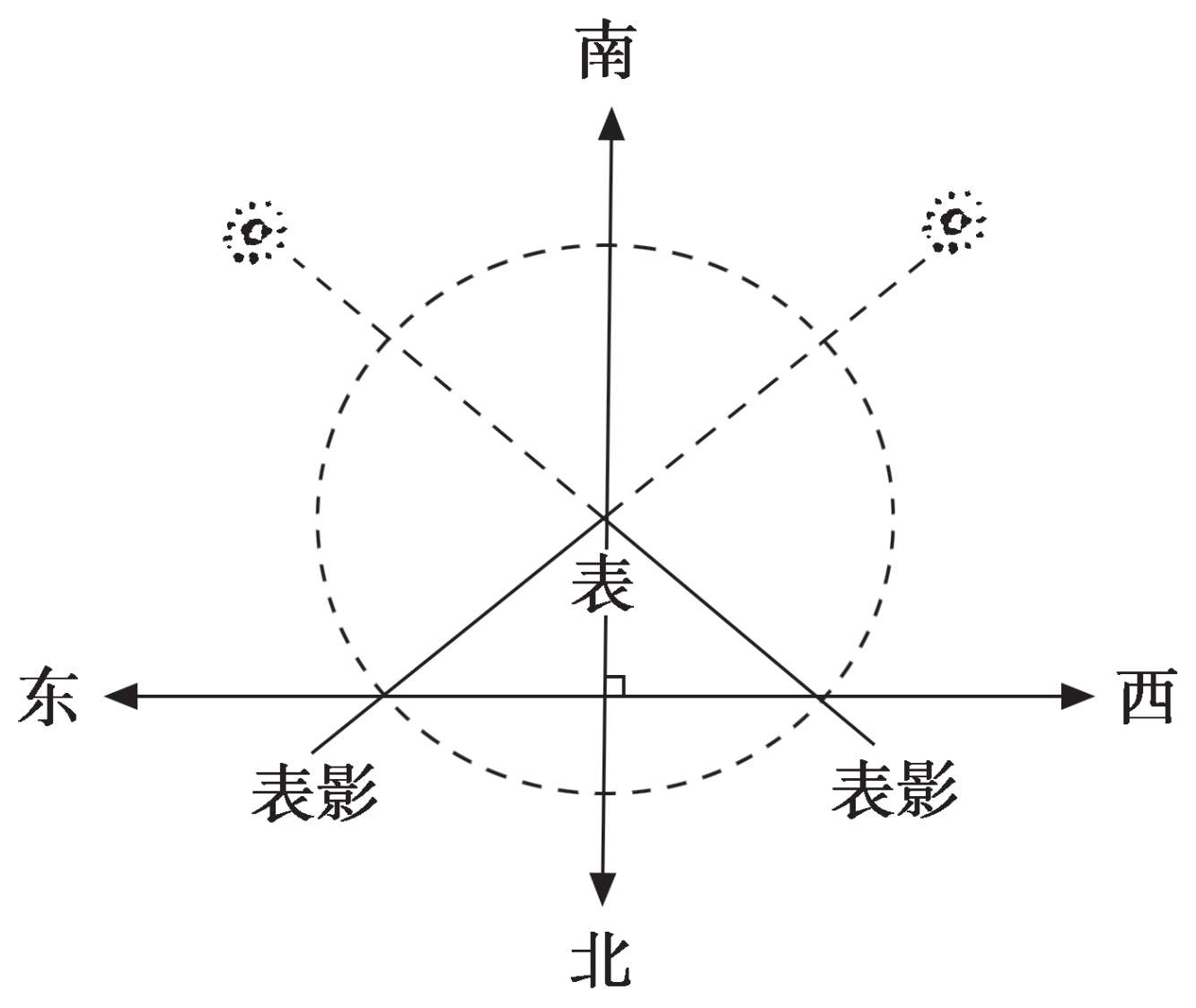 表的结构虽然简单,功能却不少。表的最初用途是确定方向。太阳并不是每天都从正东方升起正西方落下。以北京地区(地理纬度40°00′)为例,冬至日的时候,太阳于东偏南31°左右升起,于西偏南31°左右落下,远离东点西点。每年只有在3月21日(春分日)和9月23日(秋分日)前后,才可以说太阳真正是“东升西落”。那么凭表影怎样来确定方向呢?古代以表立处为圆心作一个任意圆,然后连接日出日没时表影与圆周相交的两点,便得到正东正西方向,并由东西而知南北(见图3-1)。为了提高测量精度,也可多划几个任意圆,取多次平均值。不过,日出日没时的表影常常比较模糊,即使多次测量,也难免会有较大误差。如果采用上午或下午两次等长的表影,取其端点的连线,一样可获知东西方向。元代天文学家郭守敬的定向仪器“正方案”正是利用这一原理设计的。