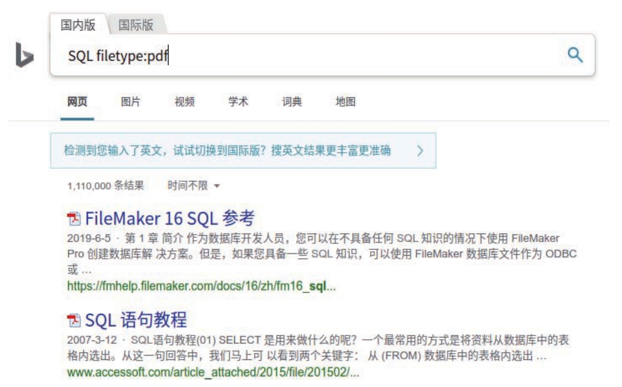 有时想找PDF、Word、epub等指定类型的文件的时候,就可以用这个关键词来进行限定,例如想搜索包含SQL内容的PDF文件,如图1-2-4所示。