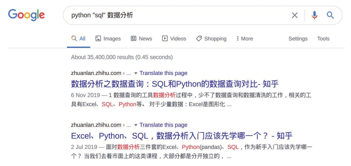如果需要在搜索结果中必须包含某一个关键词,那么可以对该关键词添加双引号。如输入python“sql”数据分析,那么在所有搜索结果中一定会包含“sql”这个词,如图1-2-5所示。