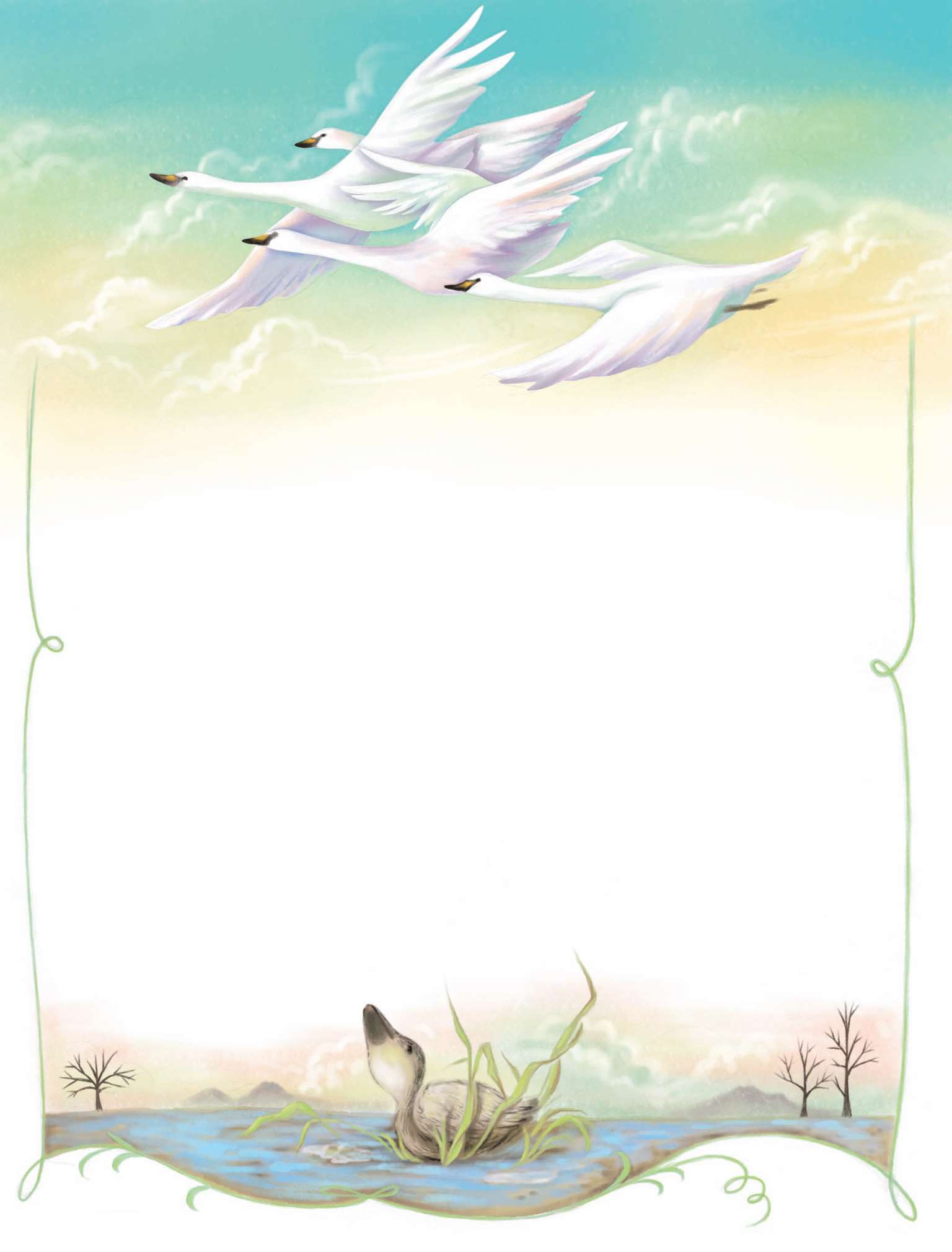 一天,当太阳高高兴兴地沉下去的时候,从丛林里飞起一大群漂亮的大鸟。小鸭从来没有见过这么美丽的鸟,浑身是闪亮的白毛,颈子细长。他们是天鹅。他们发出了一种奇特的声音,舒展着漂亮的长翅膀,飞离寒冷的地区,到暖和的不结冰的大湖栖息。他们飞得高高的,很高很高。丑小鸭的心情奇异地不安起来,他像一只轮子似的在水里一圈圈地转悠,把颈子伸得长长的望着这些鸟,叫了两声,声音很高很奇怪,连他自己听了都有些后怕。啊,他太喜欢这些漂亮又幸福的鸟!当他再也看不见这些鸟的时候,马上钻到水底,又钻了出来,失魂落魄似的。他不知道这种鸟叫什么,不知道他们飞向何方,可是他——从来没有喜欢过别的东西的他,却非常喜欢他们。他怎么能奢望自己能和他们一样漂亮呢,只要鸭子能容忍他在他们中间,他就高兴了——可怜的丑家伙!
