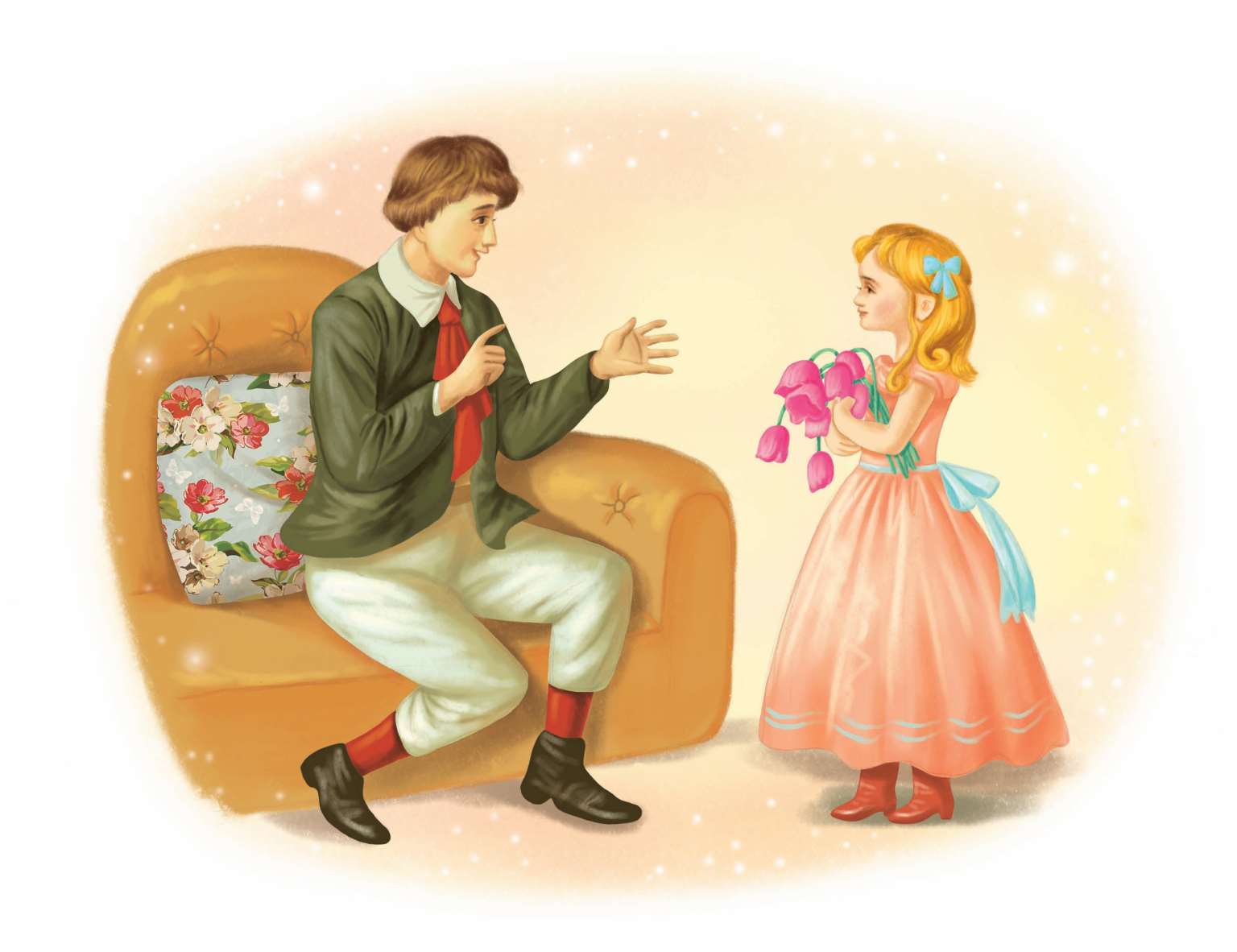 “不,你们不能死!”索菲亚说,亲吻着花儿。忽然,大厅的门开了,一大群漂亮的花儿跳着舞进来,小伊达简直想不出,这些花儿是从什么地方来的,肯定都是王宫那边的花儿。走在最前面的是两朵玫瑰,它们头上都戴着小小的金冠,这是国王和王后;随后便是紫十字花和石竹,它们向四周致意。它们带来了乐队,罂粟和牡丹吹着豌豆荚,满脸通红。蓝色的铃兰花和白色小雪球花,发出叮叮当当的响声,就像身上挂着铃铛一样。音乐很有趣。然后又进来了许多别的花儿,都跳着舞,蓝色的紫罗兰、红色的千喜花、春黄菊、樱草花都来了。花儿相互亲吻着,看起来它们真开心!