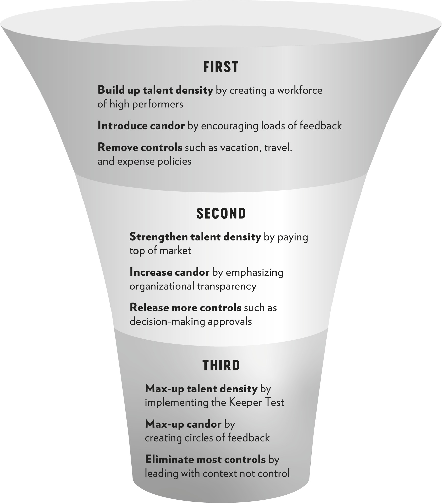 Best of all, once you start developing this type of culture, a virtuous cycle kicks in. Removing controls creates a culture of “Freedom and Responsibility” (a term Netflix employees use so much that they now just say “F&R”), which attracts top talent and makes possible even fewer controls. All this takes you to a level of speed and innovation that most companies can’t match. But you can’t reach this level in one go.