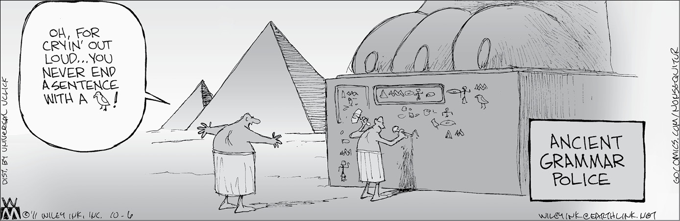 The cartoon is not much of an exaggeration. According to the English scholar Richard Lloyd-Jones, some of the clay tablets deciphered from ancient Sumerian include complaints about the deteriorating writing skills of the young. 6