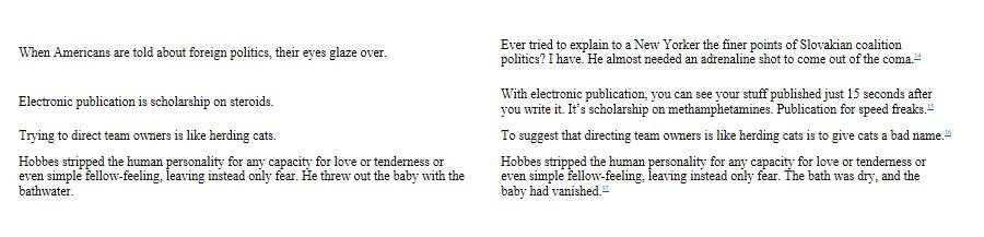 Though no writer can avoid idioms altogether—they’re part of the English lexicon, just like individual words—good writers reach for fresh similes and metaphors that keep the reader’s sensory cortexes lit up. Shakespeare advises against “adding another hue unto the rainbow”; Dickens describes a man “with such long legs that he looked like the afternoon shadow of somebody else”; Nabokov has Lolita plopping into a seat, “her legs splayed, starfish-style.” 18 But you don’t have to be a great fiction writer to engage a reader’s mental imagery. A psychologist explains a computer simulation in which activation builds up in a neuron until it fires “like popcorn in a pan.” 19 An editor looking to sign up new talent writes about attending a funeral at which “the concentration of authors was so dense, I felt like an Alaskan grizzly at the foot of a waterfall, poised to pull out salmon by the paw-ful.” 20 Even the bassist of the fictional rock band Spinal Tap deserves our admiration, if not for his literary acumen then for his attention to imagery, when he told an interviewer: “We’re very lucky in the band in that we have two distinct visionaries, David and Nigel; they’re like poets, like Shelley and Byron... . It’s like fire and ice, basically. I feel my role in the band is to be somewhere in the middle of that, kind of like lukewarm water.”