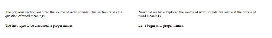 I didn’t think so. That tedious paragraph was filled with metadiscourse—verbiage about verbiage, such as subsection, review, and discussion . Inexperienced writers often think they’re doing the reader a favor by guiding her through the rest of the text with a detailed preview. In reality, previews that read like a scrunched-up table of contents are there to help the writer, not the reader. At this point in the presentation, the terms mean nothing to the reader, and the list is too long and arbitrary to stay in memory for long.