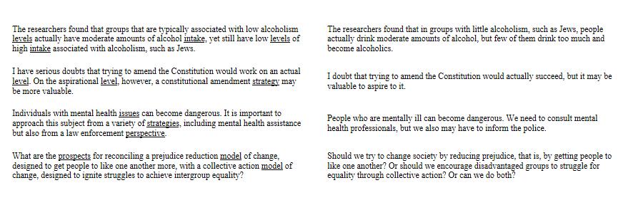 Could you recognize a “level” or a “perspective” if you met one on the street? Could you point it out to someone else? What about an approach, an assumption, a concept, a condition, a context, a framework, an issue, a model, a process, a range, a role, a strategy, a tendency, or a variable? These are metaconcepts: concepts about concepts. They serve as a kind of packing material in which academics, bureaucrats, and corporate mouthpieces clad their subject matter. Only when the packaging is hacked away does the object come into view. The phrase on the aspirational level adds nothing to aspire, nor is a prejudice reduction model any more sophisticated than reducing prejudice. Recall that the winning sentence in the 1998 Bad Writing Contest consisted almost entirely of metaconcepts.