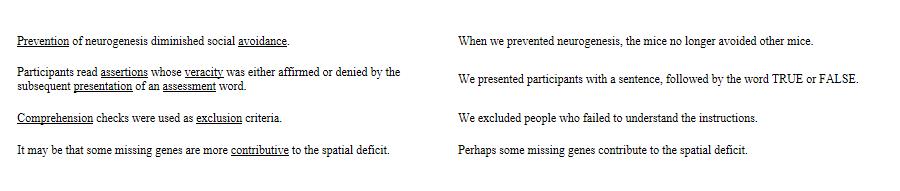 In classic prose the writer is directing the gaze of the reader to something in the world she can see for herself. All eyes are on an agent: a protagonist, a mover and shaker, a driving force. The agent pushes or prods something, and it moves or changes. Or something interesting comes into view, and the reader examines it part by part. Classic style minimizes abstractions, which cannot be seen with the naked eye. This doesn’t mean that it avoids abstract subject matter (remember Brian Greene’s explanation of the multiverse), only that it shows the events making up that subject matter transparently, by narrating an unfolding plot with real characters doing things, rather than by naming an abstract concept that encapsulates those events in a single word. Look at the stuffy passages on the left, which are filled with abstract nouns (underlined), and compare them with the more direct versions on the right: