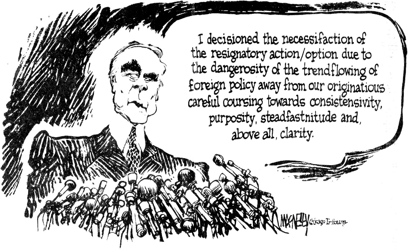Any interrogatory verbalizations? But it’s not just academics who loose these zombies on the world. In response to a hurricane which threatened the Republican National Convention in 2012, Florida governor Rick Scott told the press, “There is not any anticipation there will be a cancellation,” that is, he didn’t anticipate that he would have to cancel the convention. And in 2014 Secretary of State John Kerry announced, “The president is desirous of trying to see how we can make our efforts in order to find a way to facilitate,” to wit, the president wanted to help. Once again the professional habit has not gone unnoticed by satirists, such as in the MacNelly cartoon on the next page, which appeared when Alexander Haig, the notoriously creative suffixer who served as secretary of state in the Reagan administration, resigned from his post: