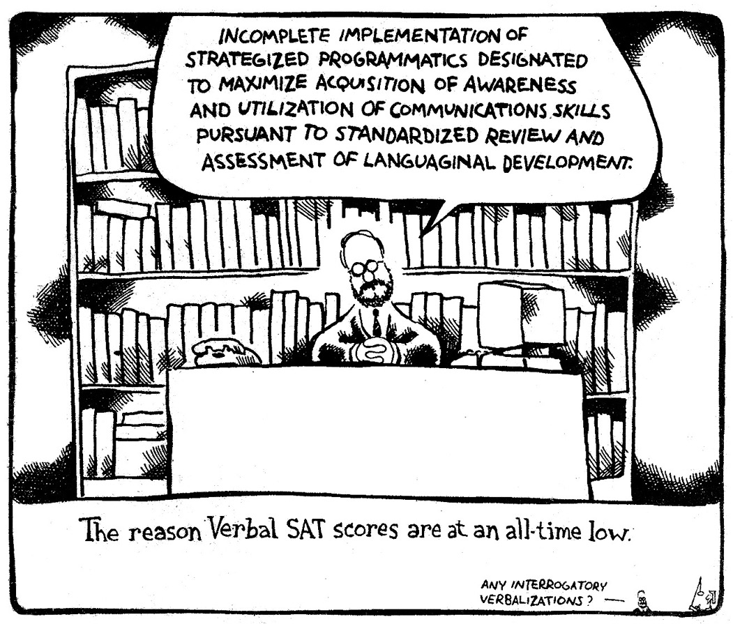 The last example shows that verbs can be drained of life when they are turned into adjectives, too, as when contribute becomes contributive to or aspire becomes on the aspirational level. As this cartoon by Tom Toles suggests, zombie nouns and adjectives are one of the signatures of academese: