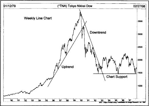 The principles of chart analysis apply to both stocks and futures. Actually, technical analysis was first applied to the stock market and later adapted to futures. With the introduction of stock index futures , the dividing line between these two areas is rapidly disappearing. International stock markets are also charted and analyzed according to technical principles. (See Figure 1.2 .)
