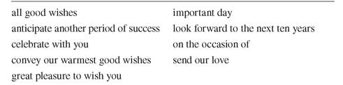 • End with good wishes for another anniversary period or for the coming years and with assurances of your affection, love, admiration, warmth, interest, delight, pleasure, continued business support, or other appropriate sentiment.
