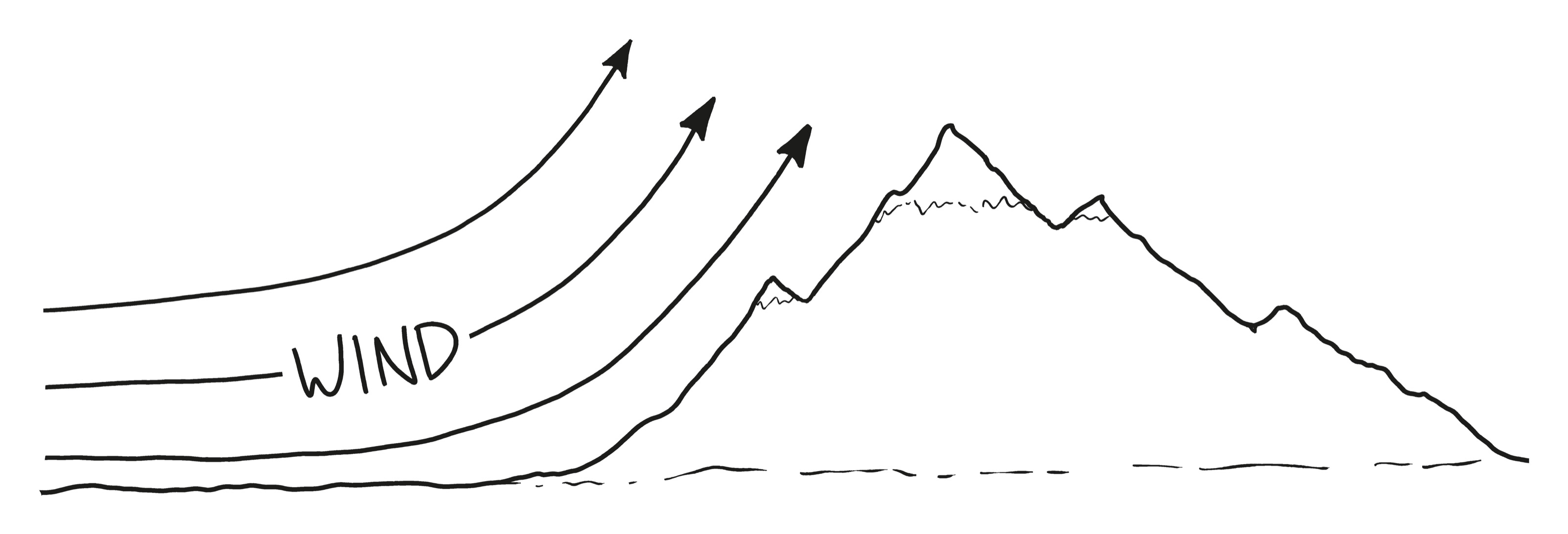Some of the strongest updrafts near the ground happen near mountain ridges. When wind encounters a mountain or ridge, the airflow can be diverted upward. In some areas, these winds can be quite fast.