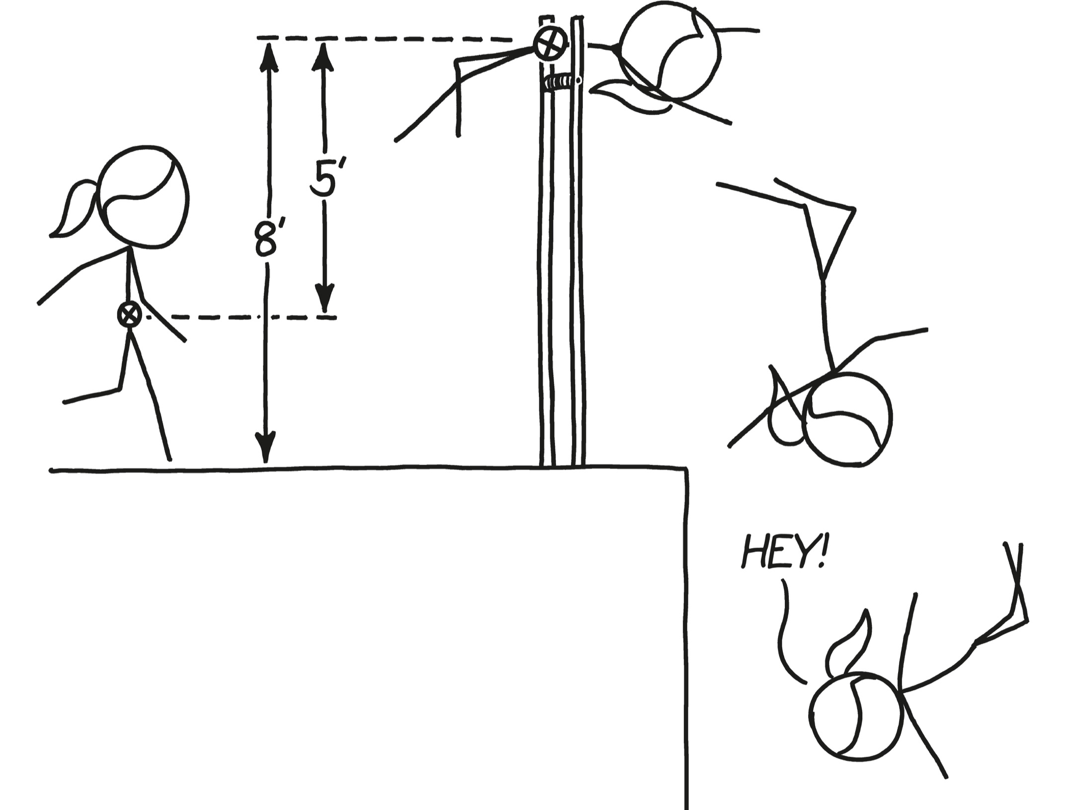 Since the pole vaulter is running before they jump, their center of gravity starts off above the ground already, which adds to the final height it reaches. A normal adult’s center of gravity is somewhere in their abdomen, usually at a height of about 55 percent of their actual height. Renaud Lavillenie, the world record holder in the men’s pole vault, is 1.77 meters tall, so his center of gravity adds another 0.97 meters or so, giving a final predicted height of 6.08 meters.