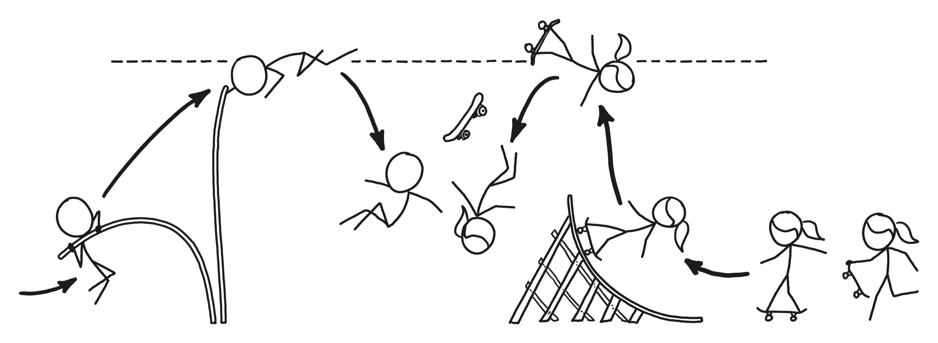 The physics of pole vaulting are interesting, and don’t revolve around the pole nearly as much as you might think. The key to vaulting isn’t the springiness of the pole, it’s the athlete’s running speed. The pole is just an efficient way to redirect that speed upward. In theory, the vaulter could use some other method to change direction from forward to up . Instead of sticking a pole in the ground, they could jump onto a skateboard, go up a smooth curved ramp, and reach just about exactly the same height as the vaulter.