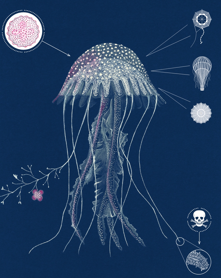 水母最神奇的一点,是繁殖方式不同寻常。多数水母的生活史中存在有性繁殖与无性繁殖的世代交替现象,即营浮游生活的水母体与营附着生活的水螅体。但也有例外,比如钵水母类的夜光游水母是受精卵直接发育成水母体,而雌雄同体的栉水母亦是如此;还有些水母会以出芽繁殖的形式直接产生小水母。我们常见到的水母,是有性世代的水母体。