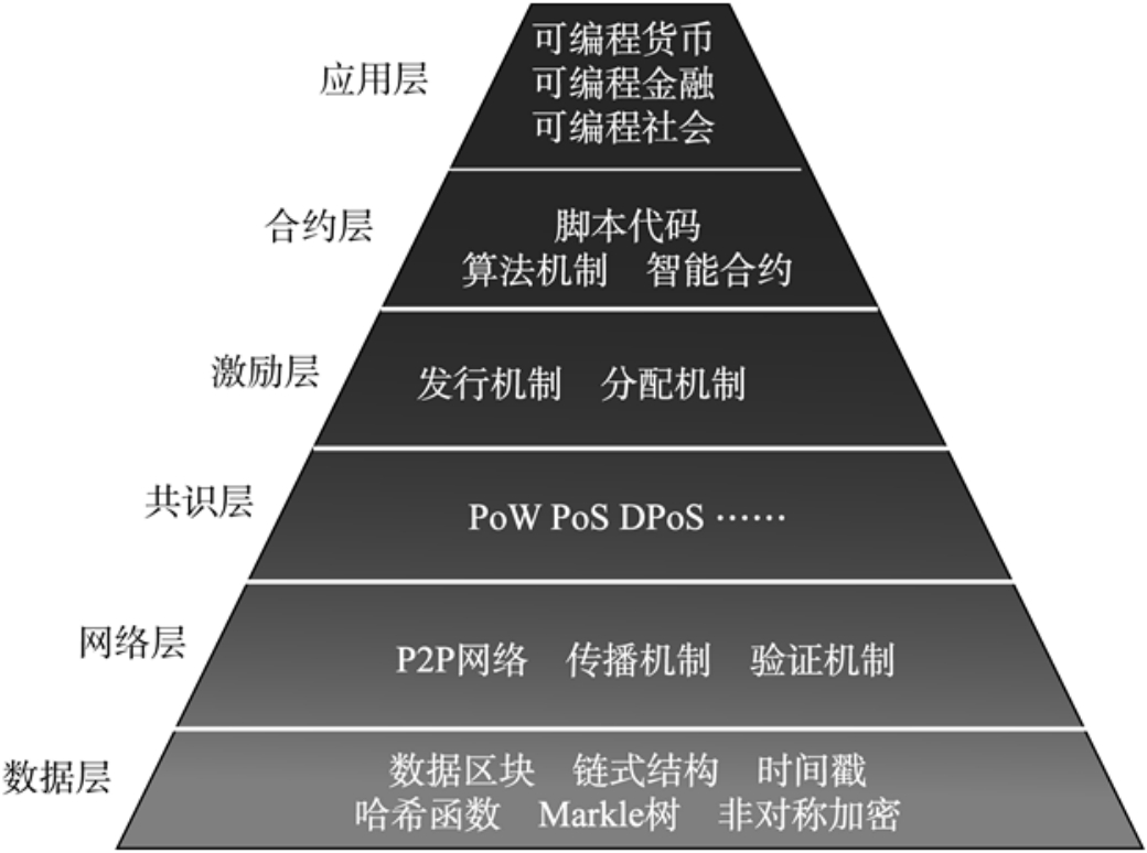 (5)合约层。合约层主要是指各种脚本代码、算法机制及智能合约等。以比特币为例,比特币是一种可编程的货币,合约层封装的脚本中规定了比特币的交易方式和过程中涉及的种种细节。
