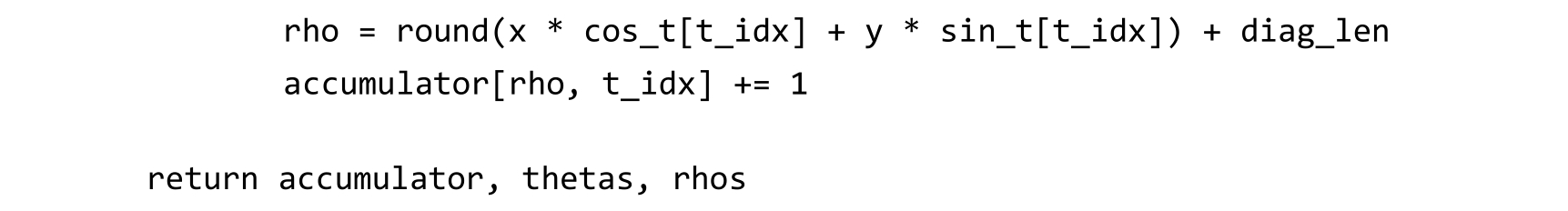 (4)在累加器中“投票”。对于每个边缘点和每个 θ 值,找到最近的 ρ 值,并在累加器中递增该索引。每个元素都表明有多少个点/像素,为潜在的候选线贡献了“票”。
