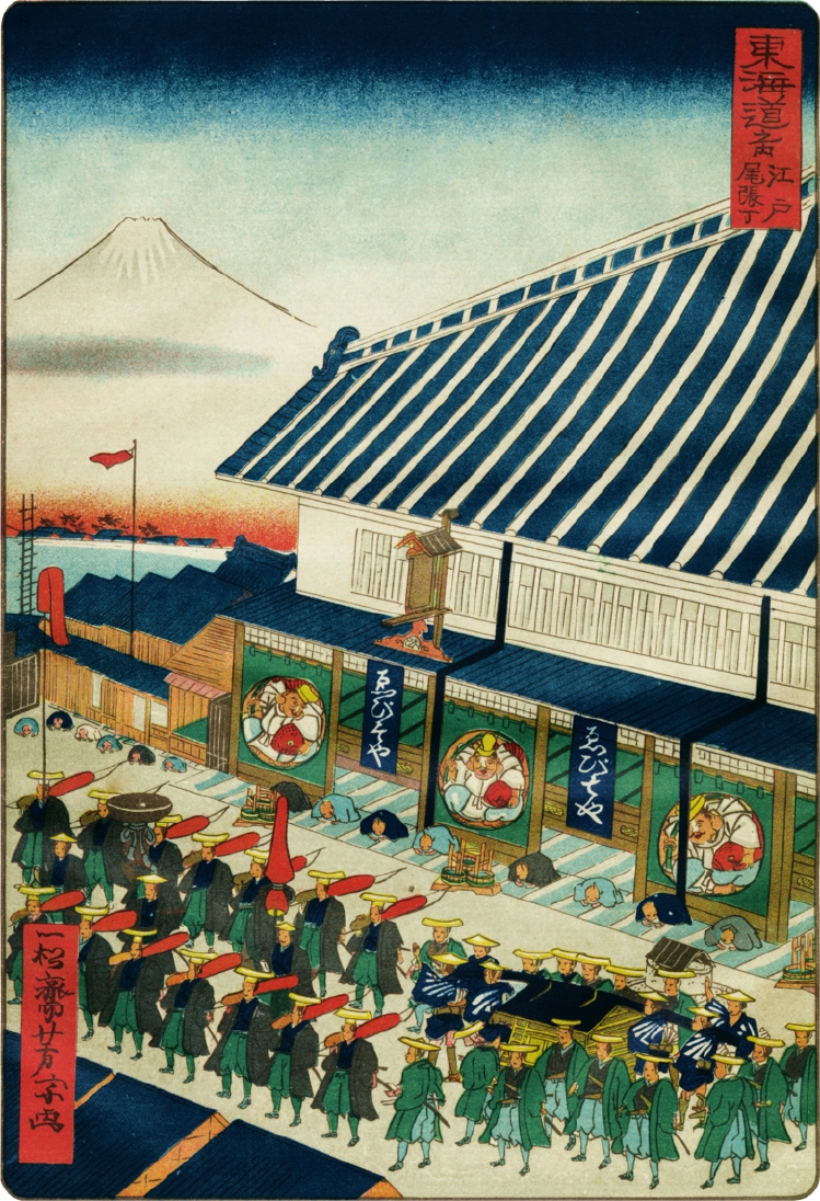 画面表现大名出行队伍的中心部分经过银座的繁华商业街,右下角四个蓝衣人扛抬着将军的乘物(高级轿舆)。乘物前面的武士,肩扛套着红布罩的铁炮(火绳枪),这在当时是威力强大的武器。因为平民不许直视将军,所以路边商铺前的市民都恭敬地跪伏在地。远景中的富士山被画得较小。