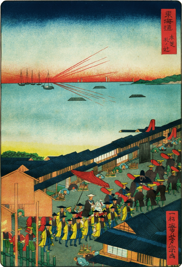 札之辻,树立法令布告牌的十字路口。江户时代盛行日本的高札制度,意在向民众宣传新法令,发布通缉令,促使民众养成守法的习惯。高札场建造在十字路口、桥口、驿站等人流密集之处,其形式简单,即将木制布告牌树在一米左右的石砌高台上,但有卫兵护卫。画面左下角是三块布告牌的背面,远景是朝日初升的江户湾。