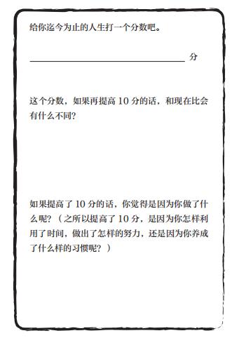 这个分数,如果再提高10分,和现在比会有什么不同?如果提高了10分的话,你觉得是因为你做了什么呢?是因为你怎样利用了时间,做出了怎样的努力,还是因为你养成了什么样的习惯,所以分数更高了呢?对于这一连串的问题,写下你的想法吧!