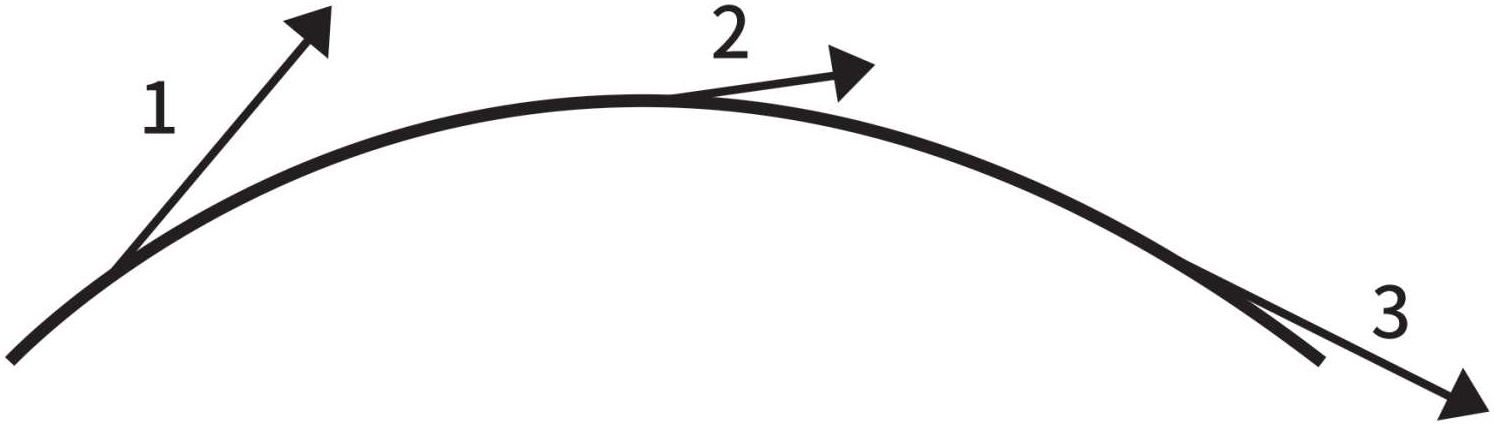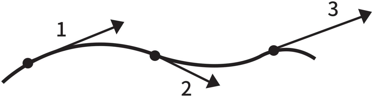 图1-10显示了同一个质点在沿一条曲线运动时在3个不同位置上的速度矢量。在该图中,我们可以看到质点运动的方向和速度的数值(表现为矢量的长度),在运动过程中都在不断变化。