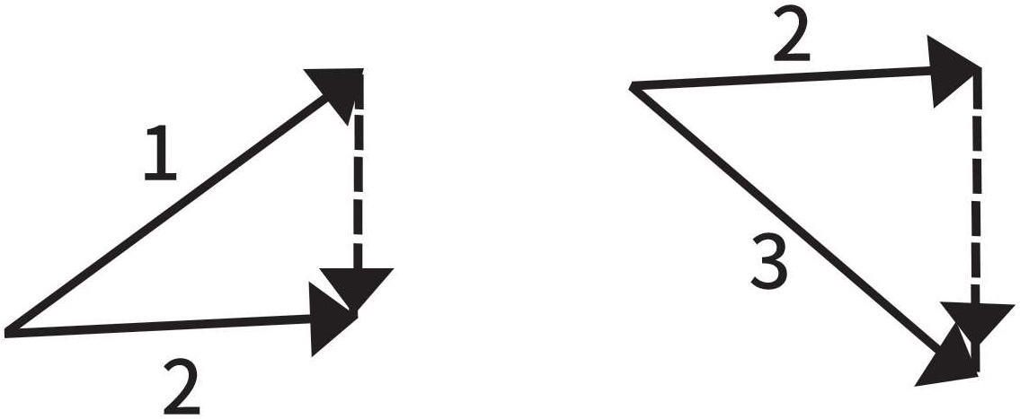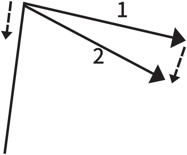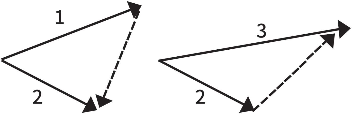 接下来我们就要谈到沿着曲线运动的质点的速度变化。这里有多种方法,我们会从中选择最简单便捷的。图1-10中的几个速度矢量分别代表曲线上不同位置的运动。我们可以再画一下前面的两个矢量,让它们从同一点出发。我们已经知道,对矢量而言,这样做是可行的(图1-11)。我们把虚线矢量称为“速度的改变”。虚线矢量的起点是第一个矢量的终点,而终点是第二个矢量的终点。乍一看,“速度的改变”这个定义似乎有些牵强且没有意义。在下述特殊情况中,也就是矢量1和矢量2的方向相同时,这个定义就变得更加清晰易懂了。当然,这又回到直线运动上去了:如果两个矢量起点相同,那么虚线矢量依旧是把它们的终点连接起来,如果画出来的话,就跟图1-6或图1-7完全相同,而以前的概念就成为新概念的一种特殊情况。在图中,我们需要把两根线分开,因为如果不这样的话,它们就会重合,难以分辨了。