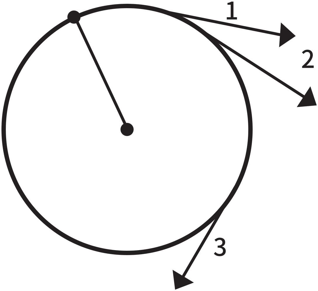 如果运动是匀速的,那么图中表示速度的所有矢量长度都相等。然而速度矢量并不都一样,因为运动的路径并非直线。只有在做匀速直线运动时,物体才不受任何外力的作用。在外力作用下,速度的大小是一样的,方向却在不停地改变(图1-14)。根据运动定律,肯定是外力导致了这种变化。在这个例子中,方向改变是因为在石子和握绳子的手指间存在一个力。于是我们马上就发现了一个新问题:力起作用的方向是什么呢?我们同样用一个矢量图来回答这个问题。如图1-14、图1-15所示,请找到运动路径上相距极近的两点,并画出其速度矢量,这样我们就可以看出速度的改变。不难看出,这个矢量以运动路径的圆心为中心,沿着绳子做运动,且永远与速度矢量或圆的切线垂直。换句话说,手通过绳子对石子施加了一个力。