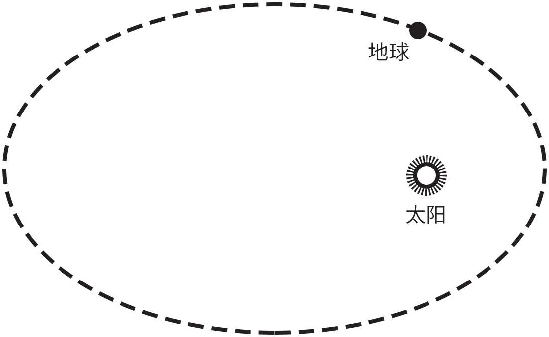 关于运动的一个非常重要的例子是地球绕太阳的运动。大家都已经知道,其运动路线是一个椭圆形的闭合曲线(图1-16)。通过画出速度改变的矢量图,我们可以看到作用在地球上的力是指向太阳的。但是这点信息还远远不够。我们希望预测地球及其他太阳系行星在任何时刻的位置,下一次日食以及许多其他天文现象的日期和持续时间。做到这些事情是有可能的,但只依靠最初的线索是不够的,因为我们不仅仅必须知道力的方向,还要知道它的绝对值,也就是力的大小。牛顿受到启发,在这方面做了一个猜想。根据他的引力定律,两个物体之间的引力与它们的距离存在一种很简单的关系:距离增加,引力减小。说得确切些,当距离增加到原来的2倍,引力就会变为原来的1/4;当距离增加到原来的3倍,引力便减小到原来的1/9。