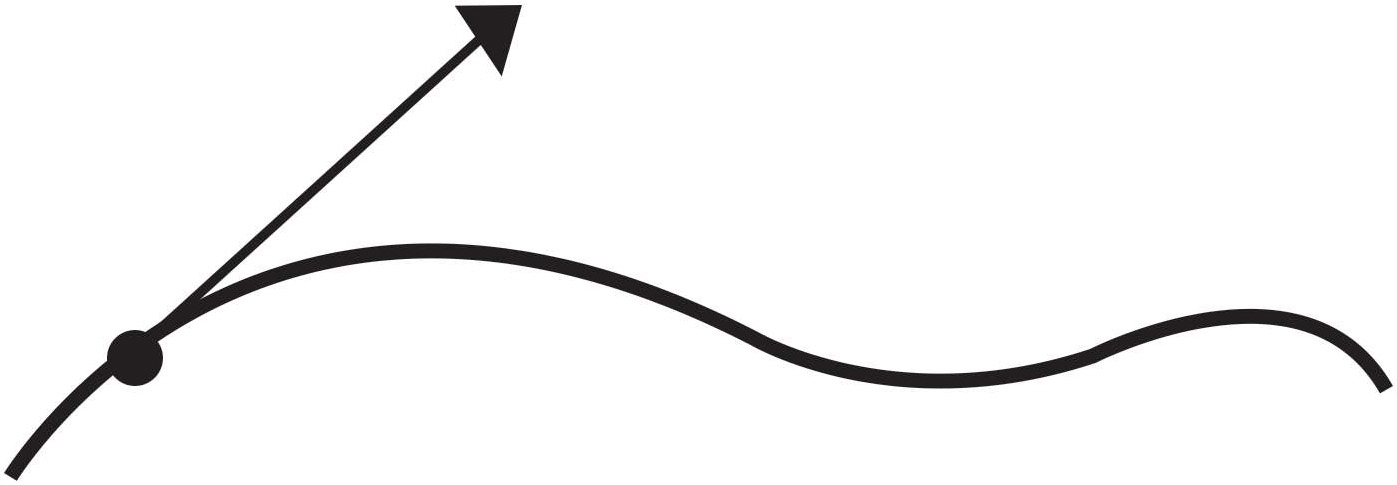图1-10中的矢量表示假设所有外力消失时我们所猜测的质点匀速运动的方向,即所谓的切线方向。透过显微镜来观察某一时刻质点的运动轨迹,我们只能看到极小一部分曲线,它显现为很短的线段,切线就是它的延长线。因此,图上画出来的矢量就代表运动的质点在该给定时刻的瞬时速度,速度矢量就在切线上,它的长度代表速率,就像汽车速度计上所显示的数值一样。