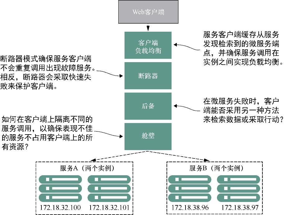 图1-13展示了这些模式如何在服务表现不佳时,保护服务消费者不受影响。第7章将会介绍这些主题。