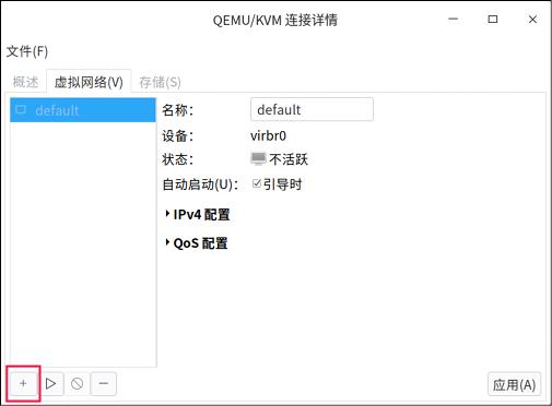 虚拟机需要连接虚拟网络才能与计算机共享网络,因此需要新建虚拟网络。打开KVM管理工具后,在“编辑”菜单中选择“连接详情”,打开图2-6所示的窗口。