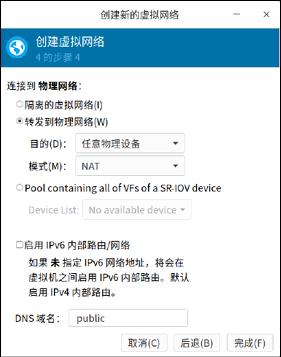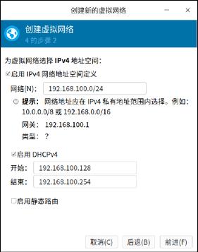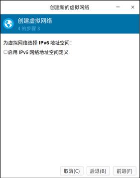 图2-6中的default 是 KVM 安装时默认创建的虚拟网络。单击图2-6中的“+”进入图2-7所示的对话框,输入网络名称,然后单击“前进”,进入图2-8所示的对话框。
